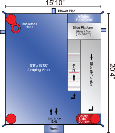 8.6 m length x 6.3 m depth x 5m height with blower at the side or